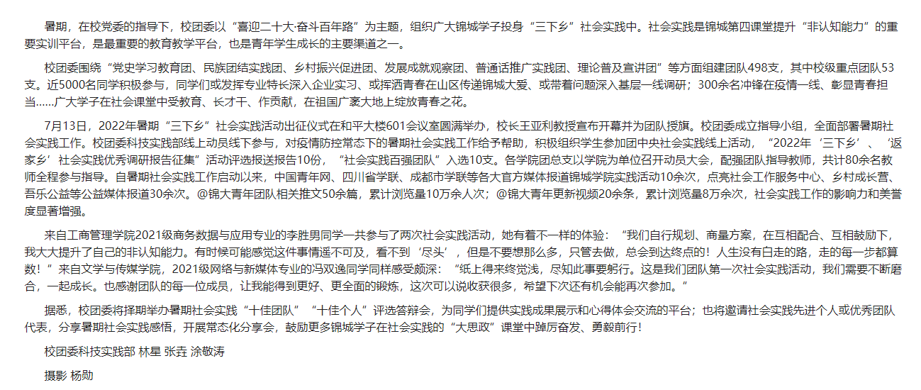 锦城学子在祖国广袤大地绽放青春之花——我校顺利开展2022年暑期社会实践活动