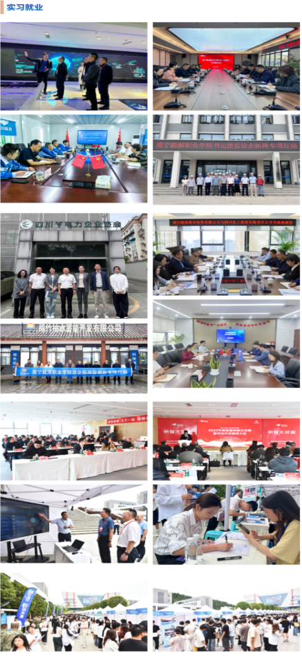 我校开展“就”在遂宁,“职”达未来校园双选会,邀请单位100余家,提供就业岗位5070个;同时,不定期举行专场招聘会20余场,与中国能源建设集团江苏省电力建设工程有限公司、中国电建集团四川工程有限公司、中国电建集团四川电力设计咨询有限责任公司、四川省水电投资经营集团、四川能投电力开发集团、四川能投发展股份有限公司、四川能投德阿锂业有限责任公司等单位开展实习就业合作,共计提供实习岗位300余个。