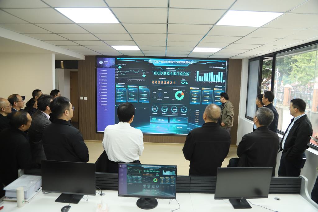 与会代表在我校后勤团队的陪同下,参观了我校文博学院实践教学中心、全媒体创研生产平台、数字非遗文创虚拟仿真公共实训中心及合同节水项目现场。代表们认真听取各项目建设背景、技术应用及运维成效的详细介绍,对我校装备建设“规划-建设-运维”全链条管理模式给予高度评价。