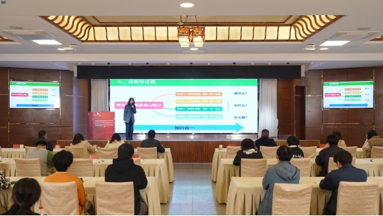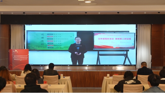 说课展示环节,来自大中小学五个学段聚焦“生态文明建设”主题,分别立足各学段学情特点,从教学目标、学情特点、教学方法、教学过程到评价设计,进行了跨学段、跨校区“同题异构”教学设计。