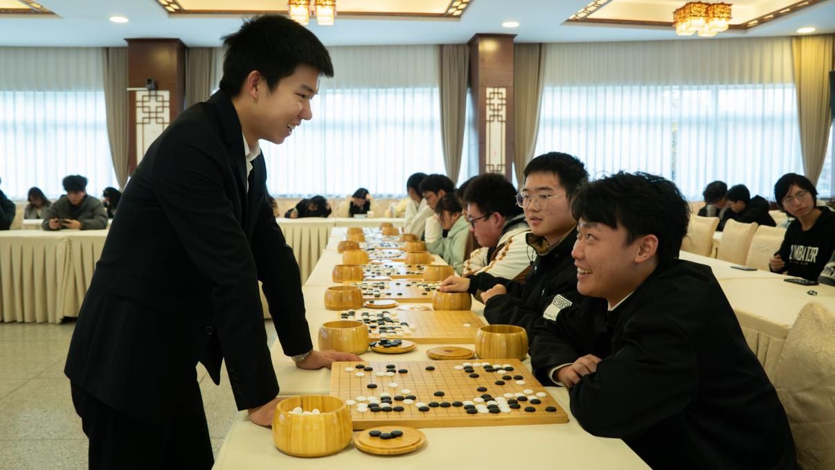接下来的互动环节氛围热烈,同学们围绕围棋怎么持续坚持学习、思维培养技巧、提升棋艺水平、压力与学业平衡等问题积极提问,辜梓豪耐心细致逐一回应。互动环节之后,现场与八名学生进行了车轮战的指导棋,通过对弈实操,手把手指导落子思路,通过实时复盘讲解棋局关键节点,让同学们近距离感受围棋的实战乐趣与思维魅力。