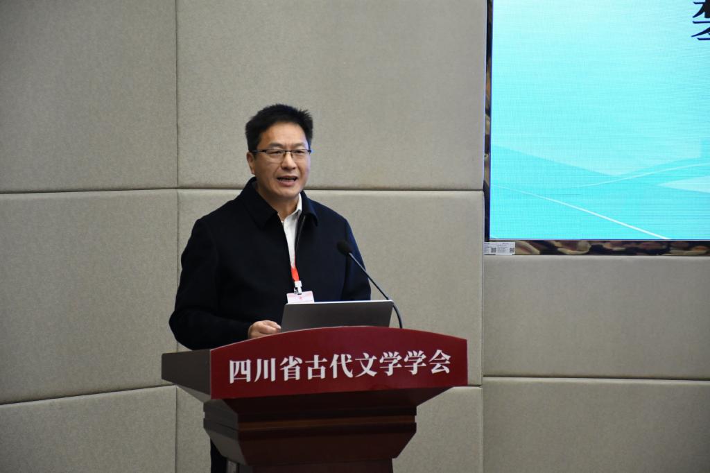 中国韵文学会常务副会长、湘潭大学雷磊教授发表致辞,强调巴蜀大地拥有悠长文脉、涌现出众多名家,寄语学会积极运用数字技术激活传统文化,通过川湘联动进一步拓宽古代文学研究视野。
